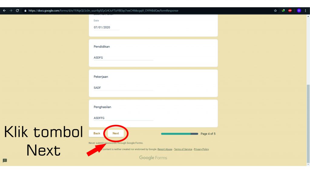 Silakan bapak ibu mengisi kelengkapan berkas satu persatu di tiap halamannya, jika satu halam sudah selesai maka klik next di bagian paling bawah. Apabila bapak dan ibu sudah mengisi form secara lengkap berikut dengan upload data diri maka jangan lupa untuk klik tombol submit agar data bapak ibu dapat tersimpan pada pangkalan data.