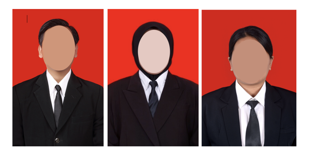 berdasi hitam panjang, berjas hitam; tidak diperbolehkan memakai kacamatan atau cadar; Background Merah